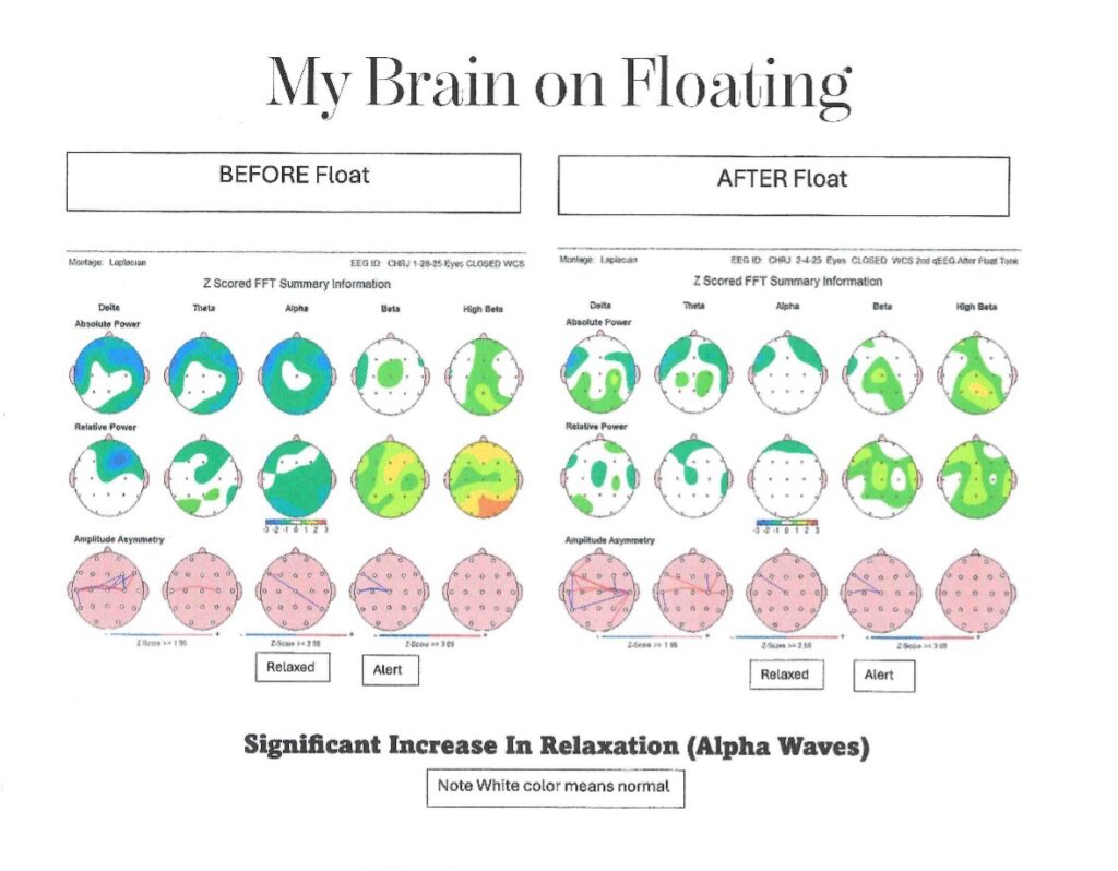 Many floaters report entering a state that feels similar to the moment just before falling asleep—deeply relaxed, but still aware. The owner of Synergy Float Spa had his brain mapped before a float and after. Below are the results.